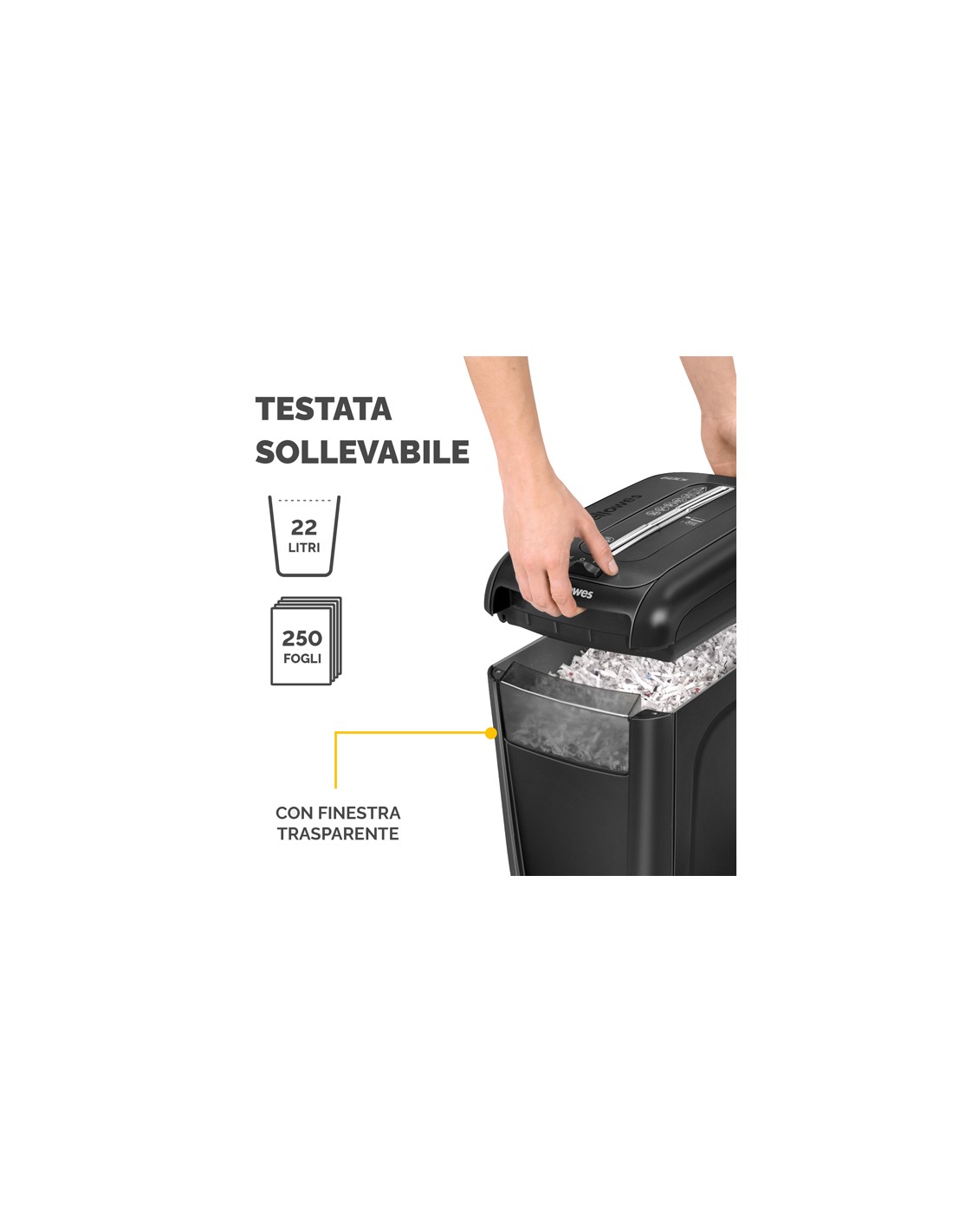 Distruggidocumenti a frammento di elevata sicurezza. Ideale per esigenze individuali moderate a casa o in piccoli uffici. Questa macchina distrugge 10 fogli per passaggio. Frammenti da 4x40mm (livello di sicurezza Din P-4) Frantuma oltre 300 pezzi ogni foglio A4. Assicura lo smaltimento sicuro di posta indesiderata, documenti aziendali interni e dati personali. Distrugge graffette, punti metallici e carte di credito. Dimensioni: 407x233x371mm.