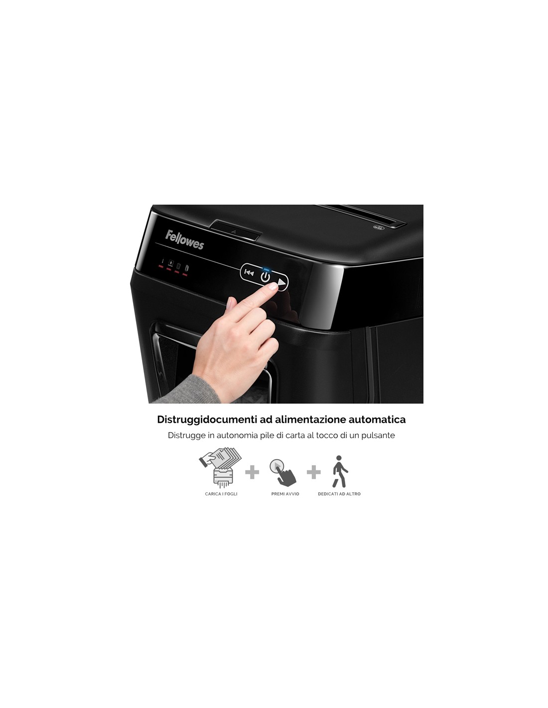 Distruggidocumenti a distruzione automatica per uso personale e piccoli uffici. La tecnologia Fellowes« AccuFeed permette di distruggere fino a 200 fogli contemporaneamente con modalità automatica, e fino a 10 fogli in modalitÓ manuale attraverso la fessura di inserimento apposita. Dotato di sistema di retromarcia automatico che previene gli inceppamenti e cestino estraibile da 32 litri, ha un ciclo di lavoro di 12 minuti. distrugge anche cd, carte di credito, posta indesiderata, carta spiegazzata o piegata, carta stampata a colori su entrambi i lati, documenti con graffette o punti metallici.