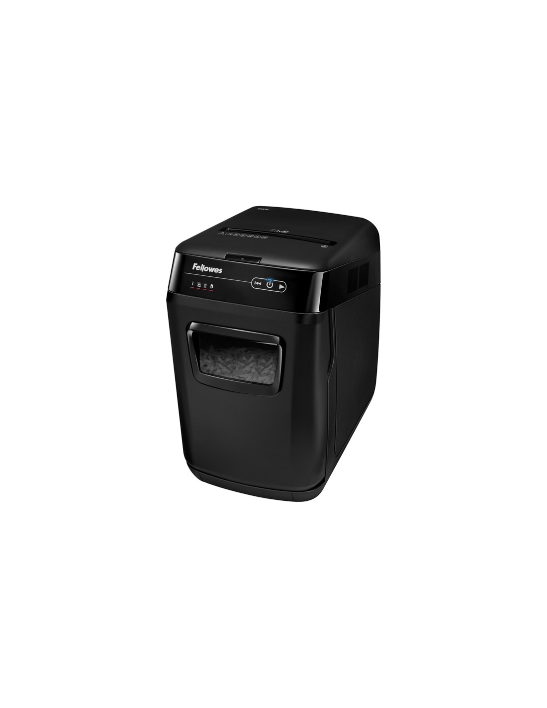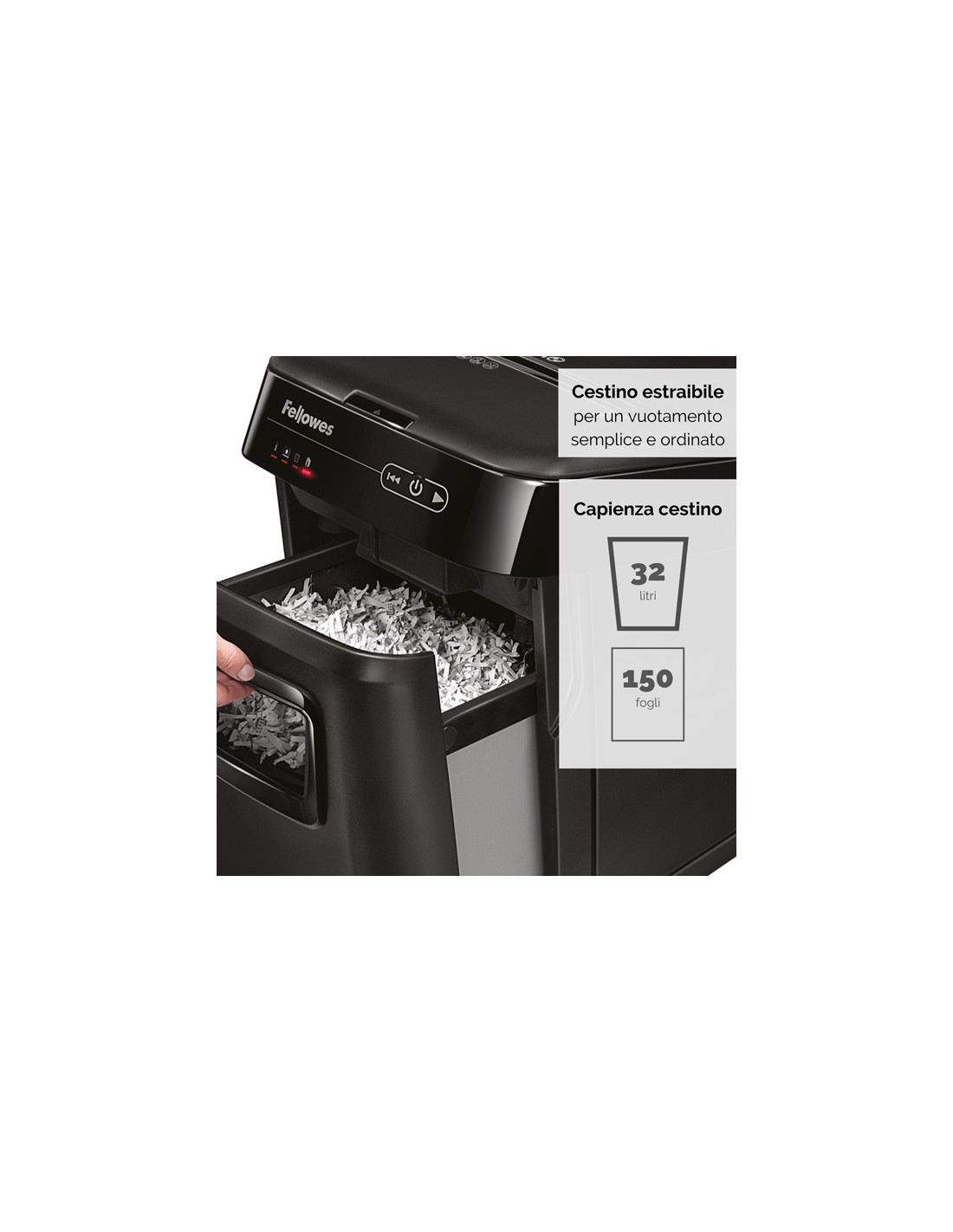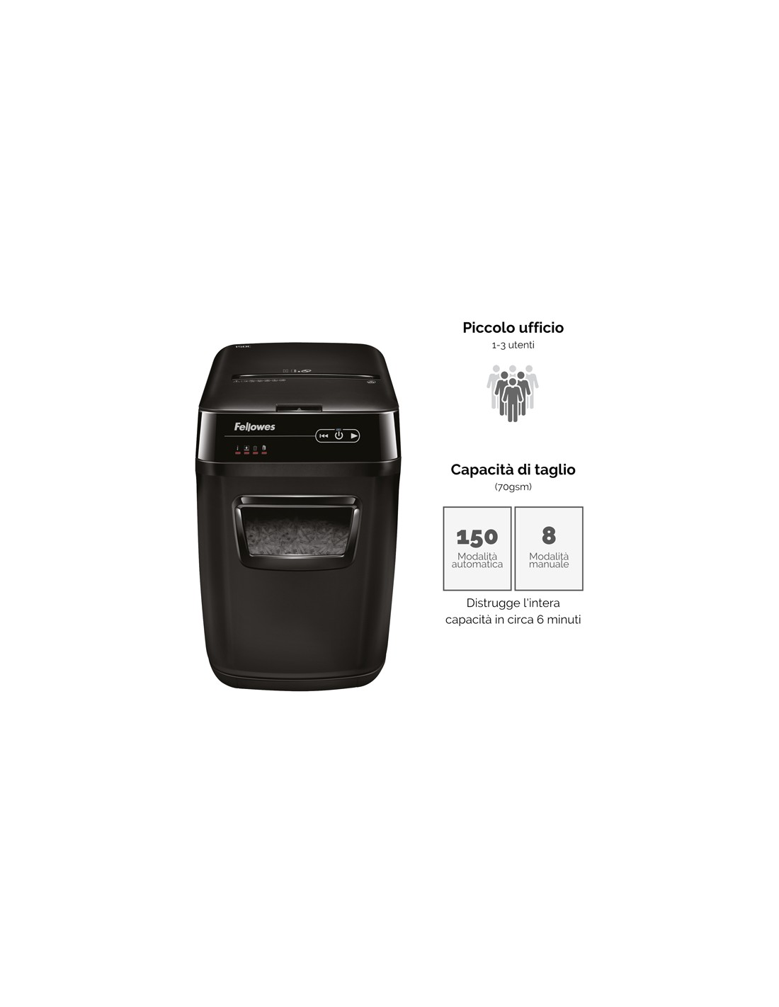 Distruggidocumenti a distruzione automatica per uso personale e piccoli uffici. La tecnologia Fellowes« AccuFeed permette di distruggere fino a 130 fogli contemporaneamente con modalitÓ automatica, e fino a 8 fogli in modalitÓ manuale attraverso la fessura di inserimento apposita. Dotato di sistema di retromarcia automatico che previene gli inceppamenti e cestino estraibile da 32 litri, ha un ciclo di lavoro di 10 minuti. Distrugge anche carte di credito, posta indesiderata, carta spiegazzata o piegata, carta stampata a colori su entrambi i lati, documenti con graffette o punti metallici fino a 20 fogli.