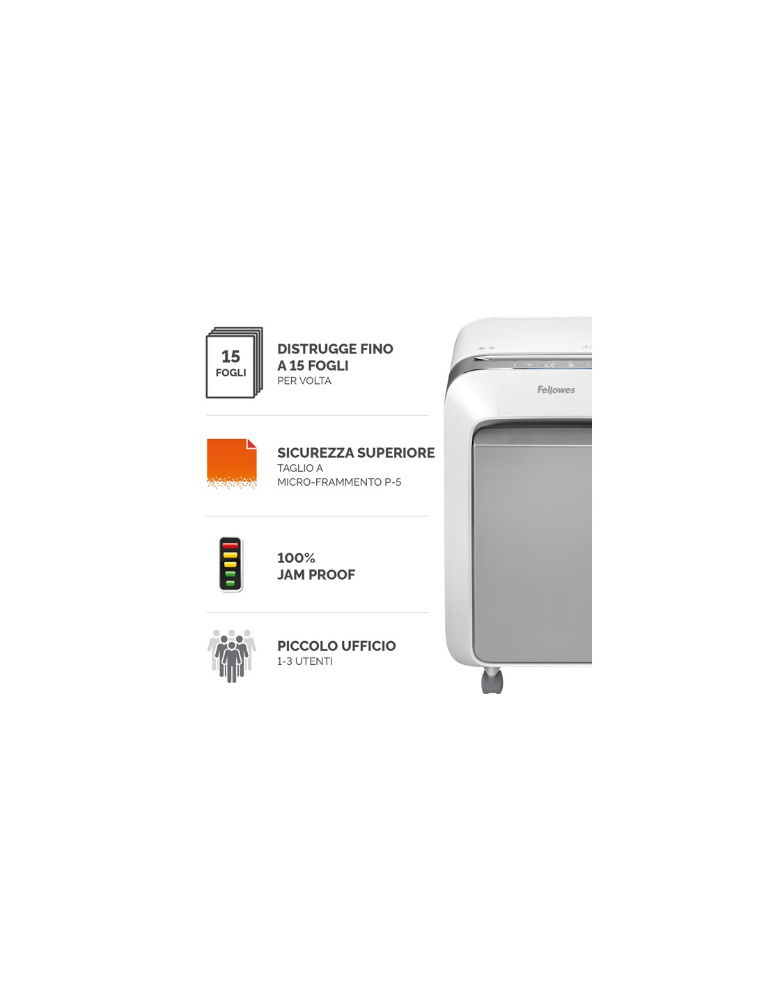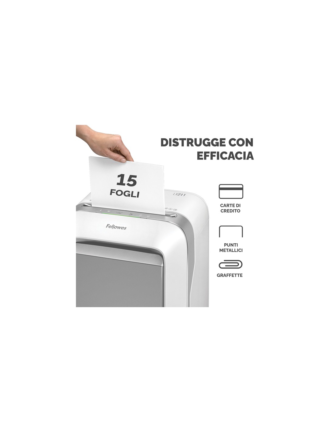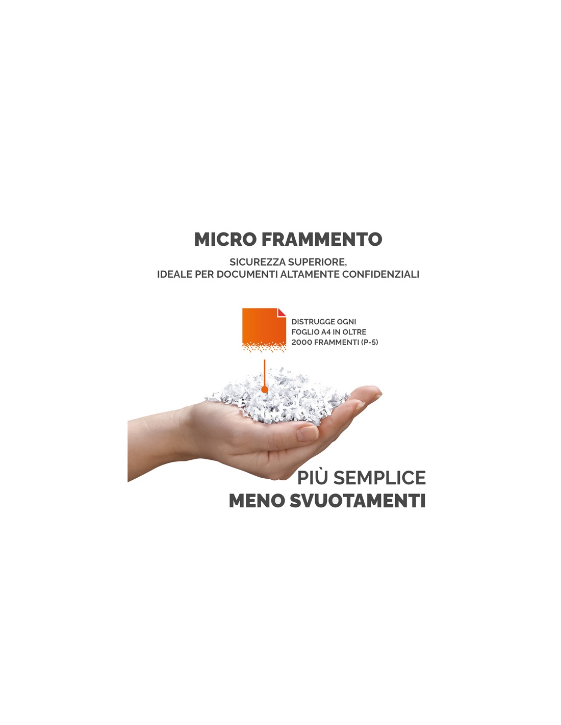 Distruggidocumenti dotato di IntelliBAR, la tecnologia reattiva di nuova generazione per un'esperienza di distruzione dei documenti più efficiente e in grado di garantire la massima produttività Risponde a 5 esigenze: rileva e risolve automaticamnete gli inceppamenti dotato di tecnologia SafeSense, la tecnologia protettiva che rileva automaticamnete se le mani o gli animali domestici sono troppo vicini e interrompe immediatamente la distruzione feedback continuo sulla possibilità di inserire più fogli per volta per massimizzare l'efficienza indicatore cestino pieno indicatore ciclo di lavoro, ti avverte quando il distruggidocumenti sta terminando il suo ciclo di lavoro e necessita di un periodo di pausa. Funzionamento silenzioso (65/70 dB). Imboccatura: 230mm. Riduce in microframmenti (2x12mm) fino a 15 fogli da 70 gr per volta. Velocità di taglio: 2 MPM. Livello sicurezza P5. Ciclo lavoro: 20min on / 15min off. Capacità cestino 23lt. Colore bianco. Dimensioni: 533x362x296mm. Peso: 12,7kg.
