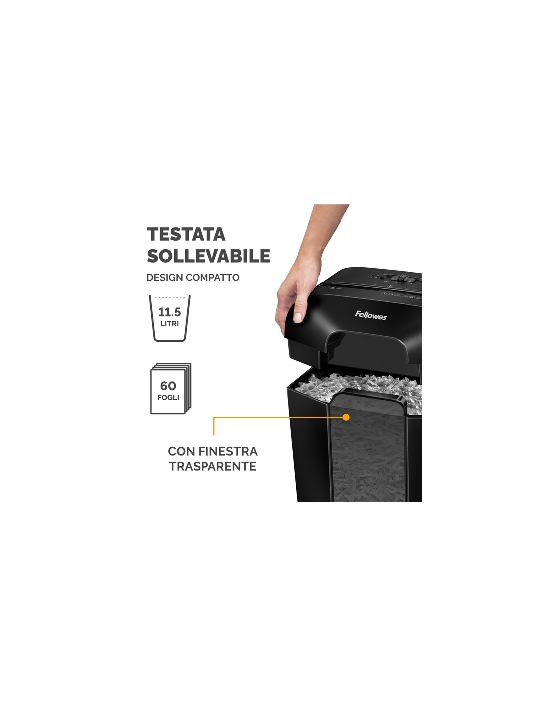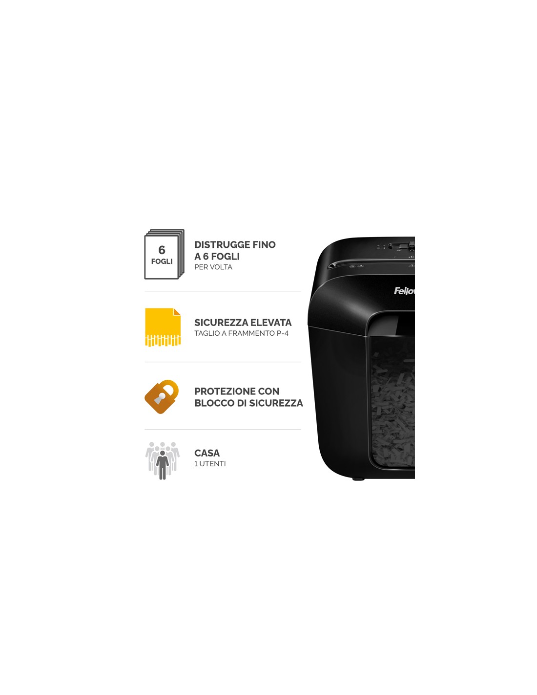 Distruggidocumenti per uso personale. Comodo cestino con testata sollevabile. Distrugge anche punti metallici graffette e carte di credito Tipo di taglio: Frammento 4x37mm Livello sicurezza: DIN P-4 Capacità di taglio: 6fg Ciclo di lavoro: 3min on / 30 min off Imboccatura: 220 mm Velocità di taglio: 2MPM Capacità cestino:11,5lt Livello rumorosità: 70 (dB) Dimensioni: 361x310x220mm Peso: 3,6kg