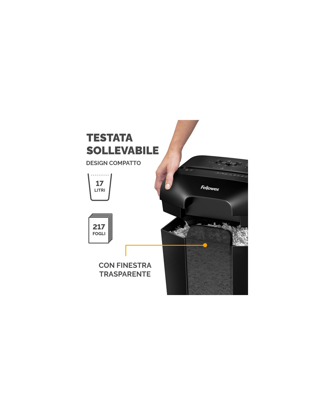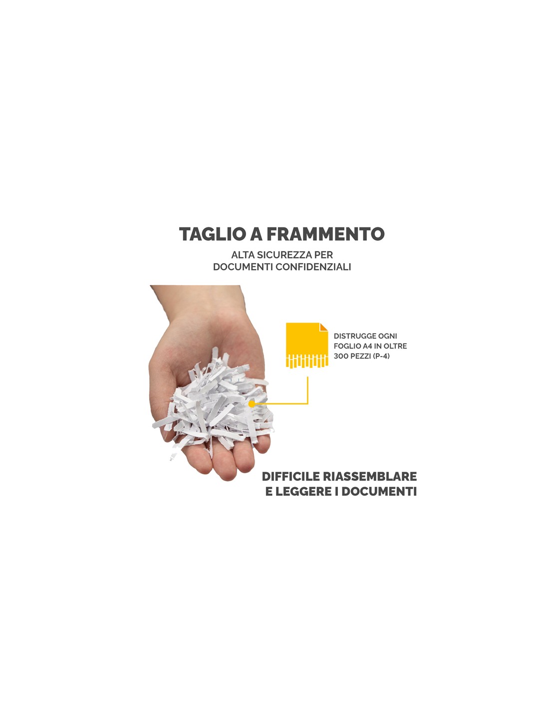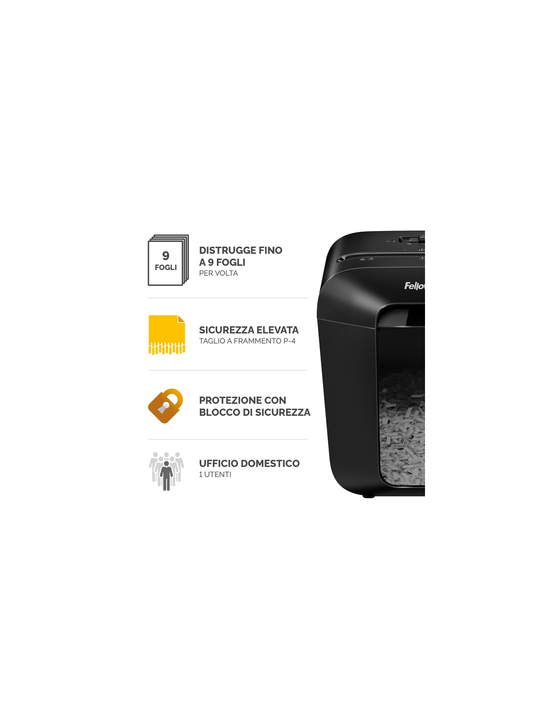 Distruggidocumenti per uso Home <(>&<)> Home Office. Distrugge fino a 9 fogli per volta. Dimensione frammento 4x37mm. Livello di sicurezza P-4. Dotata di blocco di sicurezza. Distrugge a ciclo continuo per 5 minuti , necessita di 30 minuti di raffreddamento. Cestino da 17 litri. Distrugge punti metallici, graffette e carte di credito. Dimensioni H 40 L 31 P 22cm Peso 5,2kg
