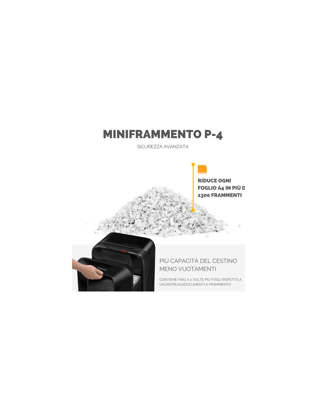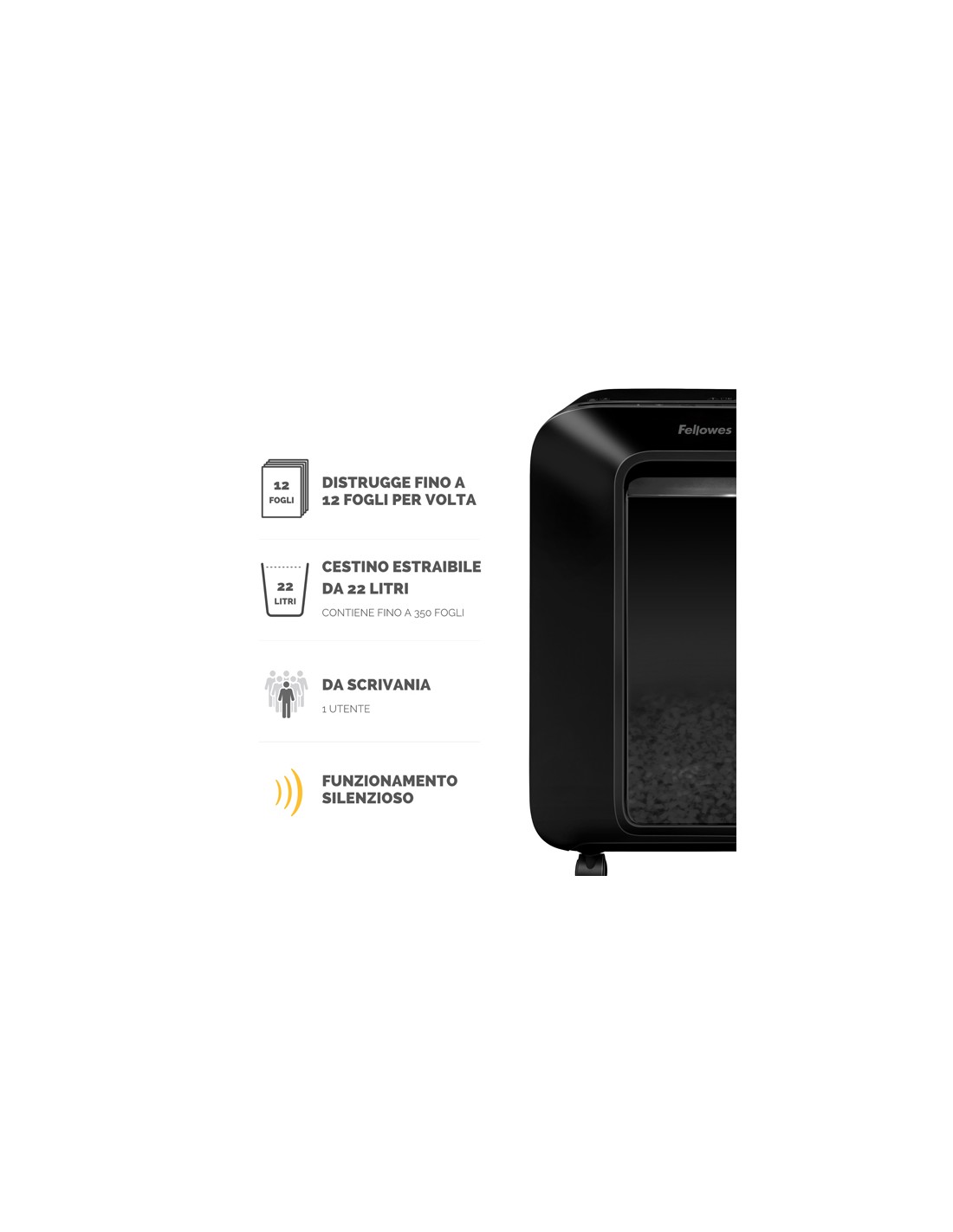 Distruggidocumenti per uso personale con tecnologia JAM PROOF ,che ferma la distruzione se si inseriscono troppi fogli e va automaticamente in retromarcia . La tecnologia INTELLIBAR fornisce un feedback continuo che permette di massimizzare la produttivitàdel distruggidocumenti evitando interruzioni. Avvisa quando la capacità del cestino e la capacità di distruzione sono quasi al limite sia quando il ciclo di lavoro sta terminado. La tecnologia SAFESENSE ferma la distruzione all'appoggio della mano sull'imboccatura evitando usi accidentali. Dimensione mini-frammenti 4x12 mm . Livello P-4. Capacità di taglio 12 fogli.Cestino estraibile da 22 litri. Distrugge in ciclo continuo per 10 minuti,15 minuti di raffreddamento.Dimensioni H 52,5 L 38,8 P 23cmPeso 9,3Kg