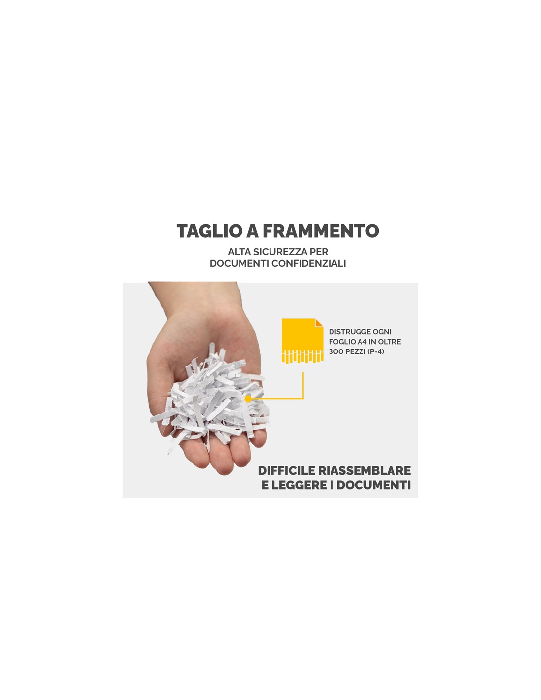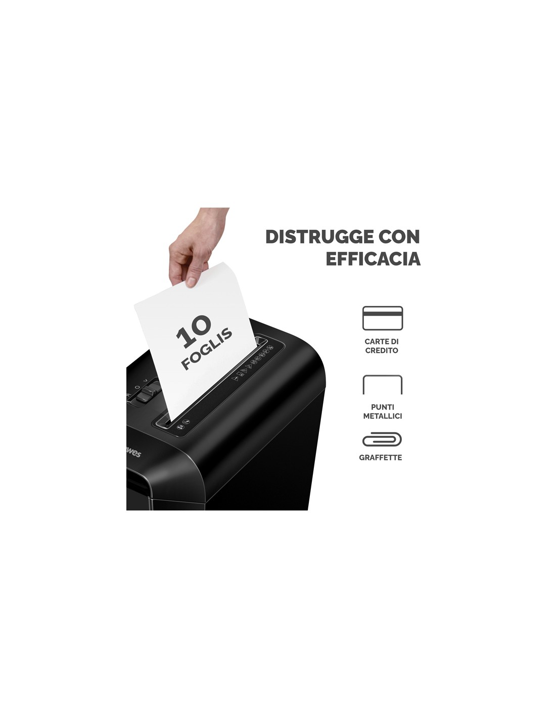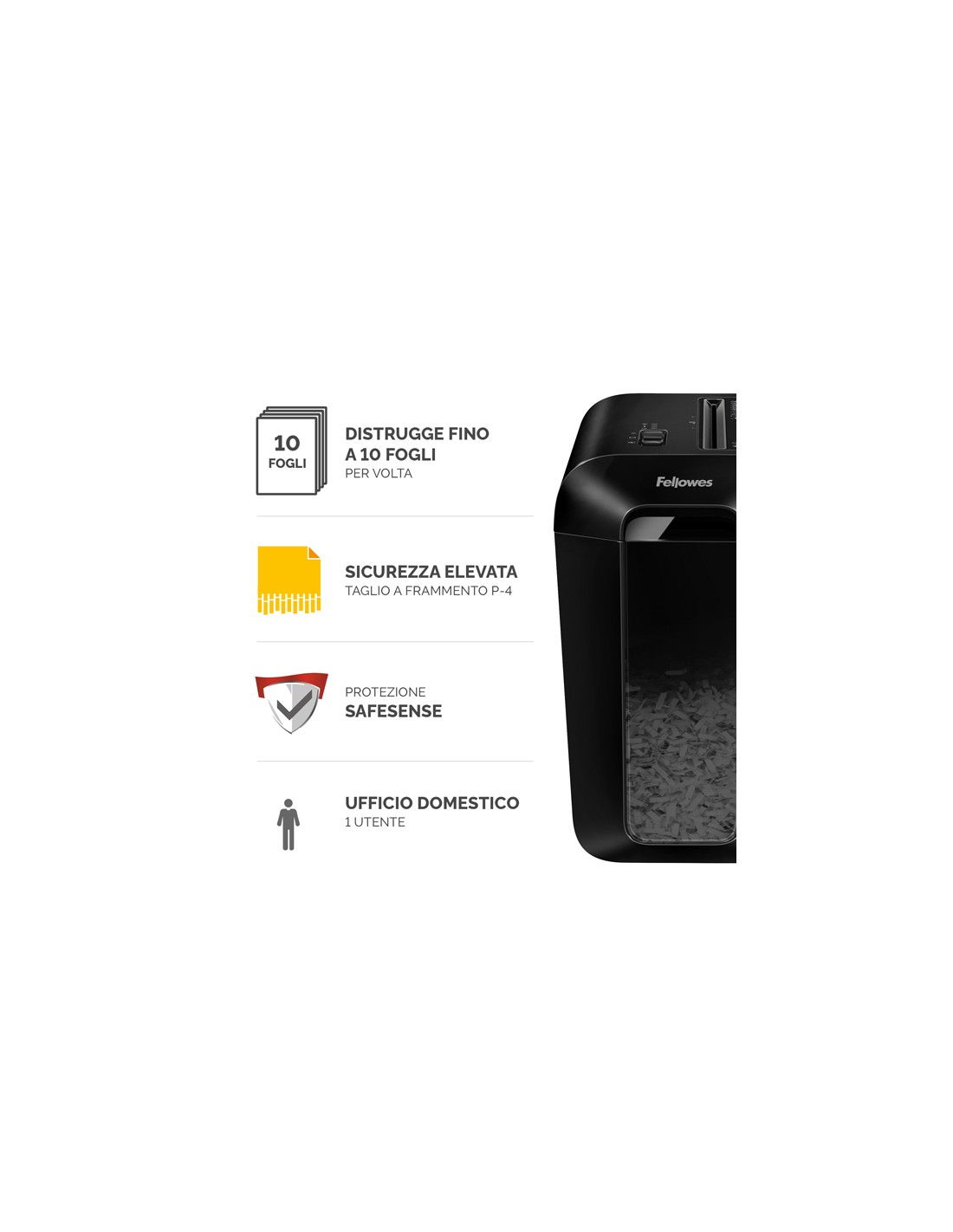 Distruggidocumenti LX65, per uso regolare a casa e in ufficio. Distrugge fino a 10 fogli in frammenti da 4x40mm (Livello DIN P-4) La tecnologia brevettata SafeSense ferma la distruzione se le mani toccano l'imboccatura della carta. Distrugge ininterrottamente fino a 6 minuti seguiti da 20 minuti di raffreddamento. Cestino da 22 litri con testata sollevabile. Distrugge anche graffette, punti metallici e carte di credito. Per uso individuale. Garanzia: 2 anni machina / 5 anni lame. Dimensioni 407 x 233 x 371mm.